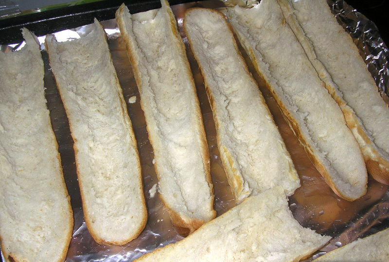 2. Багет разрезать пополам, затем − вдоль (если в Вашу духовку багет помещается по длине, то разрезать его на две половины не стоит – Ваш «крокодильчик» будет длиннее). С каждой половинки багета аккуратно вынуть мякиш, оставив лишь корку (для начинки).