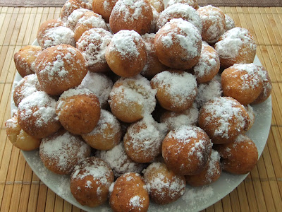 Когда шарики подрумянятся со всех сторон до золотистого цвета шумовкой вынимаем и складываем на сито, чтобы стекло лишнее масло, а потом перекладываем на блюдо и притрушиваем сахарной пудрой. И так до тех пор, пока все тесто не переработаем..