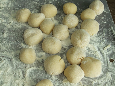 Потом выкладываем на доску 1/4 часть теста, предварительно притрусив ее мукой , чтобы можно было скатать тесто в трубочку и нарезать на небольшие кубики. Притрушиваем руки мукой..